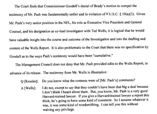 Smith: *Chortle* Us. Remember when you said that the investigation was independent? It never was; Jeff Pash, your legal lieutenant, contributed to the Wells report. The same report you were supposed to examine, with an open mind, when it was finished. And you denied Brady the opportunity to interrogate Pash. Page 34, man.