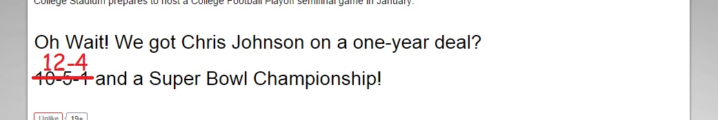 Say what you will about ARI “not playing their best football” and needing to “put together a complete game” — this Cardinals team controls their own destiny. Out of the bye at SEA and hosting CIN on SNF are games that previous coaches would have wilted under the pressure and lost. Or the potential for their two game lead on the Rams to go zero (on account of head to head) with a loss at STL. So that is what I am bracing myself for. But with the mighty Bruce Arians at the helm, I’m going to stick with my preseason prediction with one slight comic sans change.