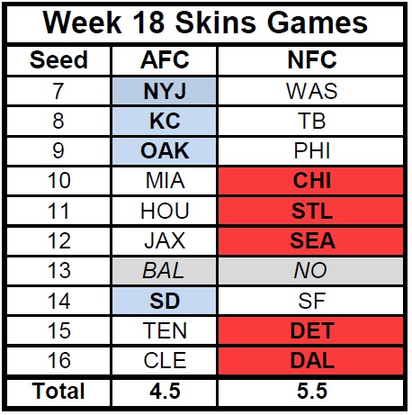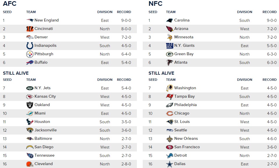 I’m not going to get into evaluating teams and schedules because that shit just gets tedious and, if you care about experts making predictions, read the weekly gambling post. What I really wondered was, if the playoffs started today and we got to make the conferences face-off in a skins style tournament, who would come out as having the better non-playoff field. Yes, these futile exercises are what the 2015 NFL season offers but…