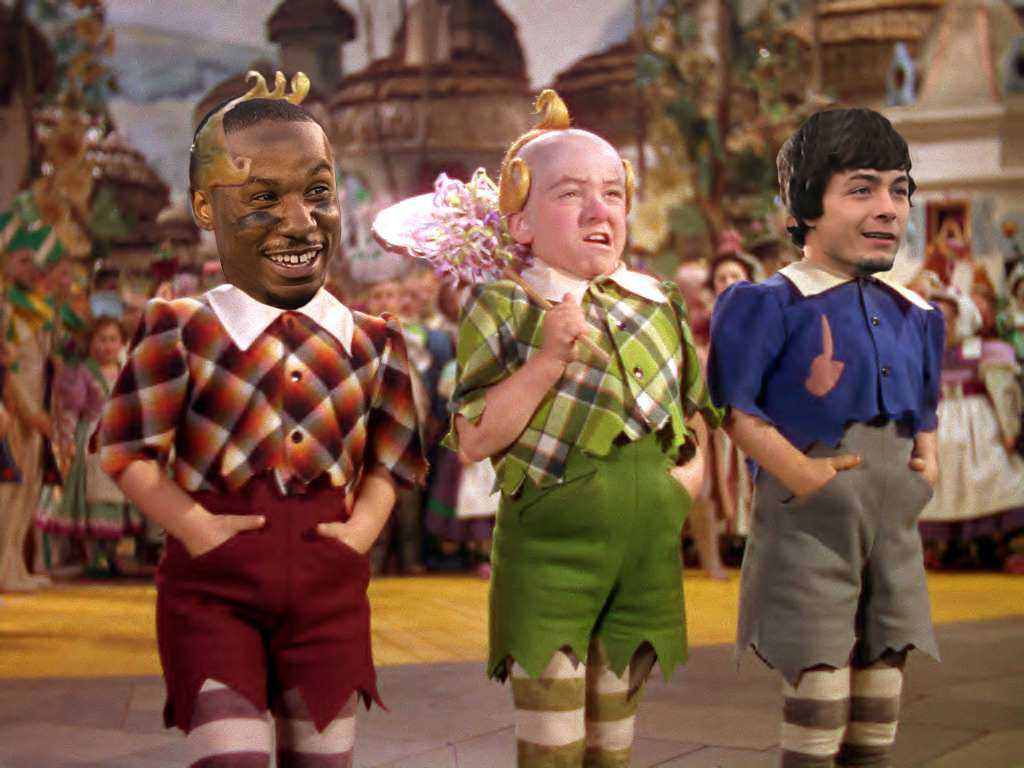 [They skip down the road, arm in arm, singing San Diego Super Chargers, until they reach a gate guarded by a redhead wielding a red hammer, who is accompanied by a sniveling lackey who is carrying a giant pail of water with him]