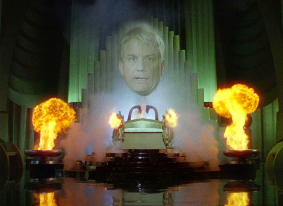 [They enter a chamber filled with many fancy special effects, and a large and bland face appears to float in midair before them]