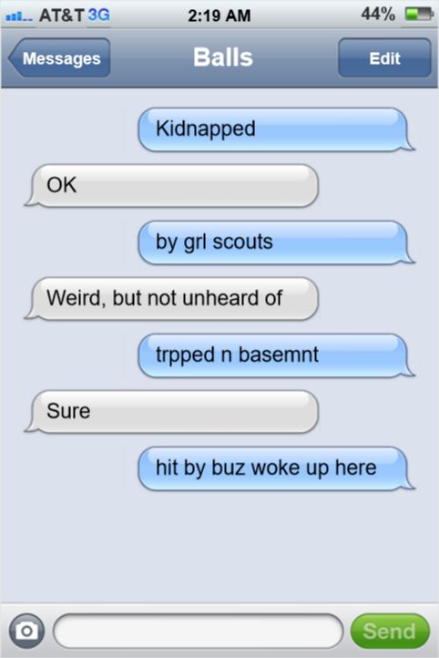The scene: A dank, dark basement. Ballsofsteelandfury wakes up on the floor.