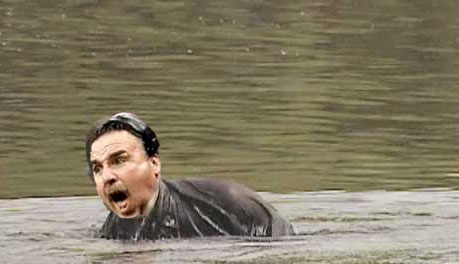 [The homeless man falls into the pond and seems to be trying to swim towards them, poorly.]