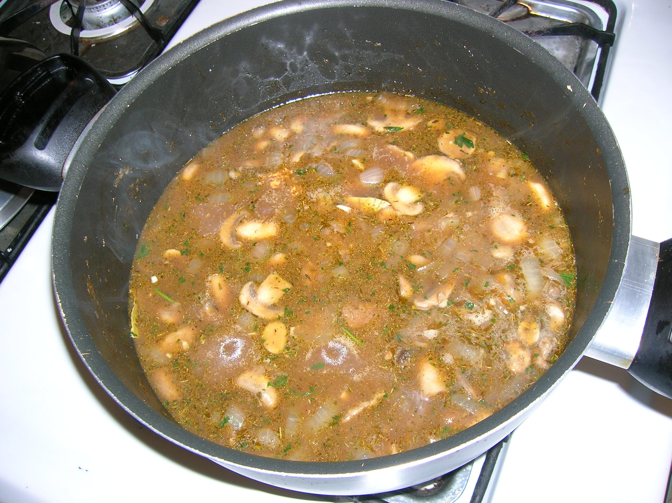 Bring this to a boil and add in the bay leaves, parsley and thyme along with the browned meat. Reduce the heat and cook on a slow simmer for 65-75 minutes.