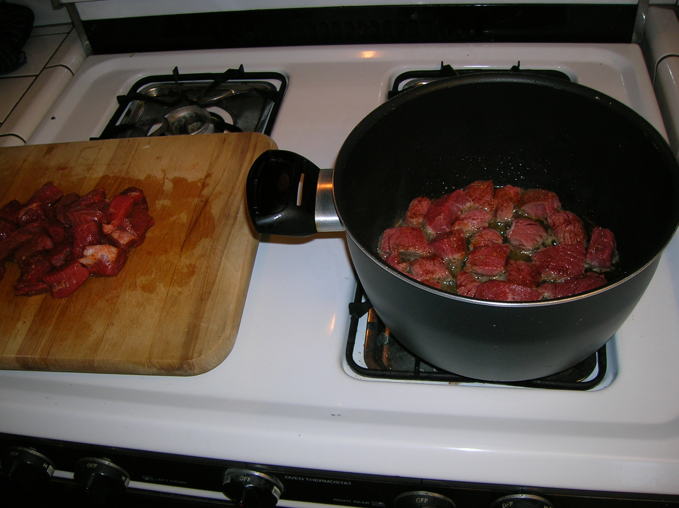 Brown on all sides for about 5 minutes and then remove the meat from the pan and place in a large bowl. Repeat until all the beef has been browned.