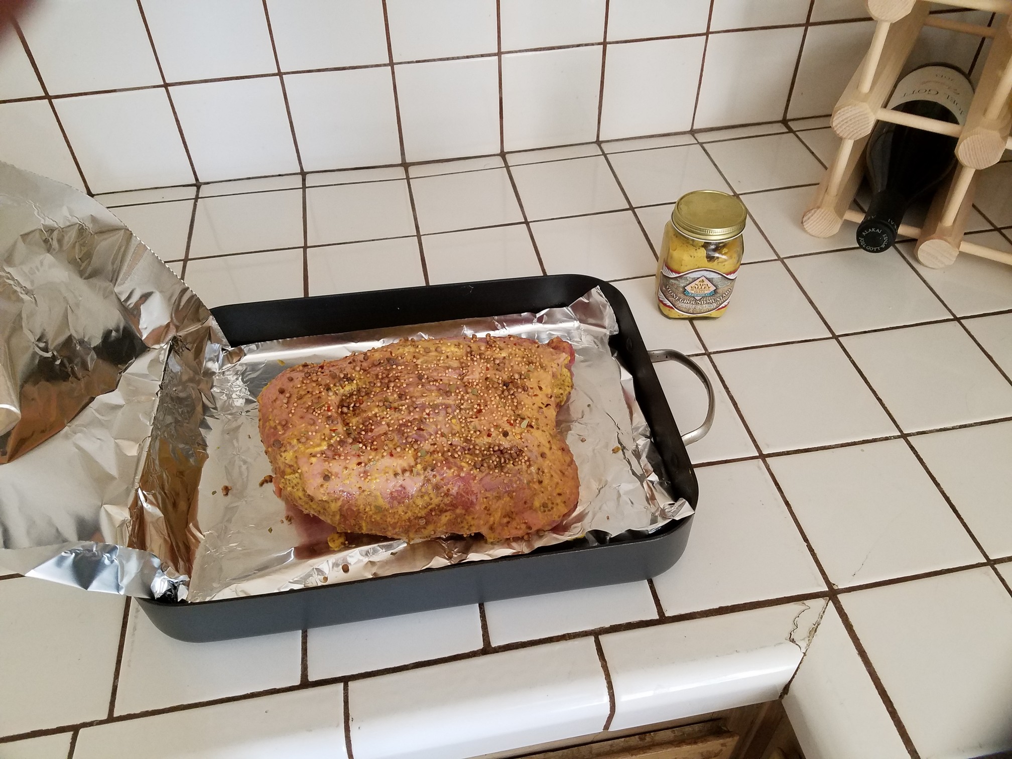 A vastly superior version gets a nice rub of whole grain mustard, sprinkle the spice blend on top, wrap tightly in foil and cook on 300 for about 3 1/2 to 4 hours.
