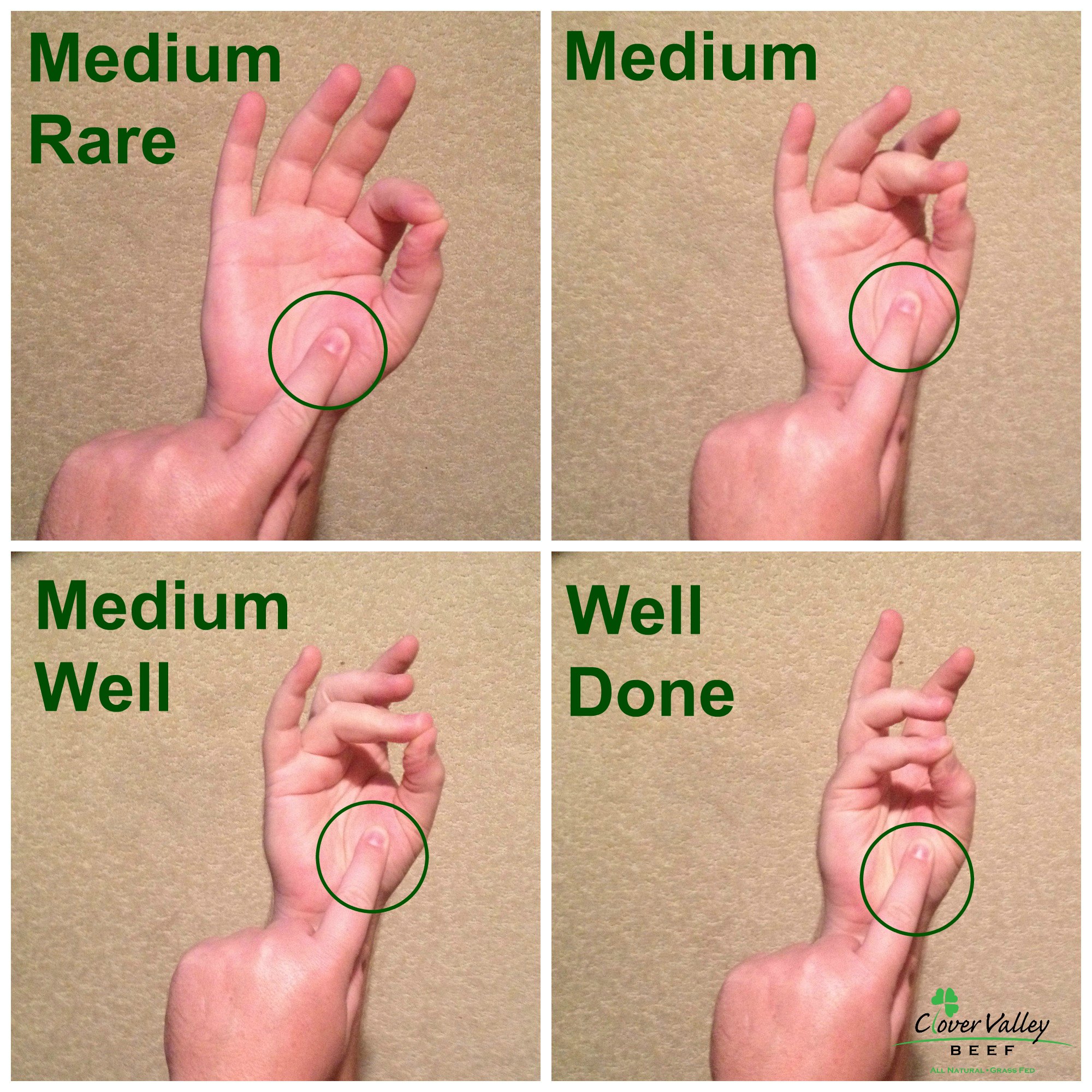 This is achieved by touching the base of your thumb with various movement of the fingers. Hold your open palm out and touch the base of the thumb, this is the touch equivalent of raw meat, make the “OK” sign with the index finger and touch the base of the thumb for what should feel like medium rare, put your middle finger to your thumb (all the while resisting the urge to give somebody the bird) touch the base of the thumb and you have the touch equivalent of medium. Do the same thing with you ring finger and thumb, touch the base of the thumb and you have the touch equivalent of medium well and the same trick with the pinky for well done.