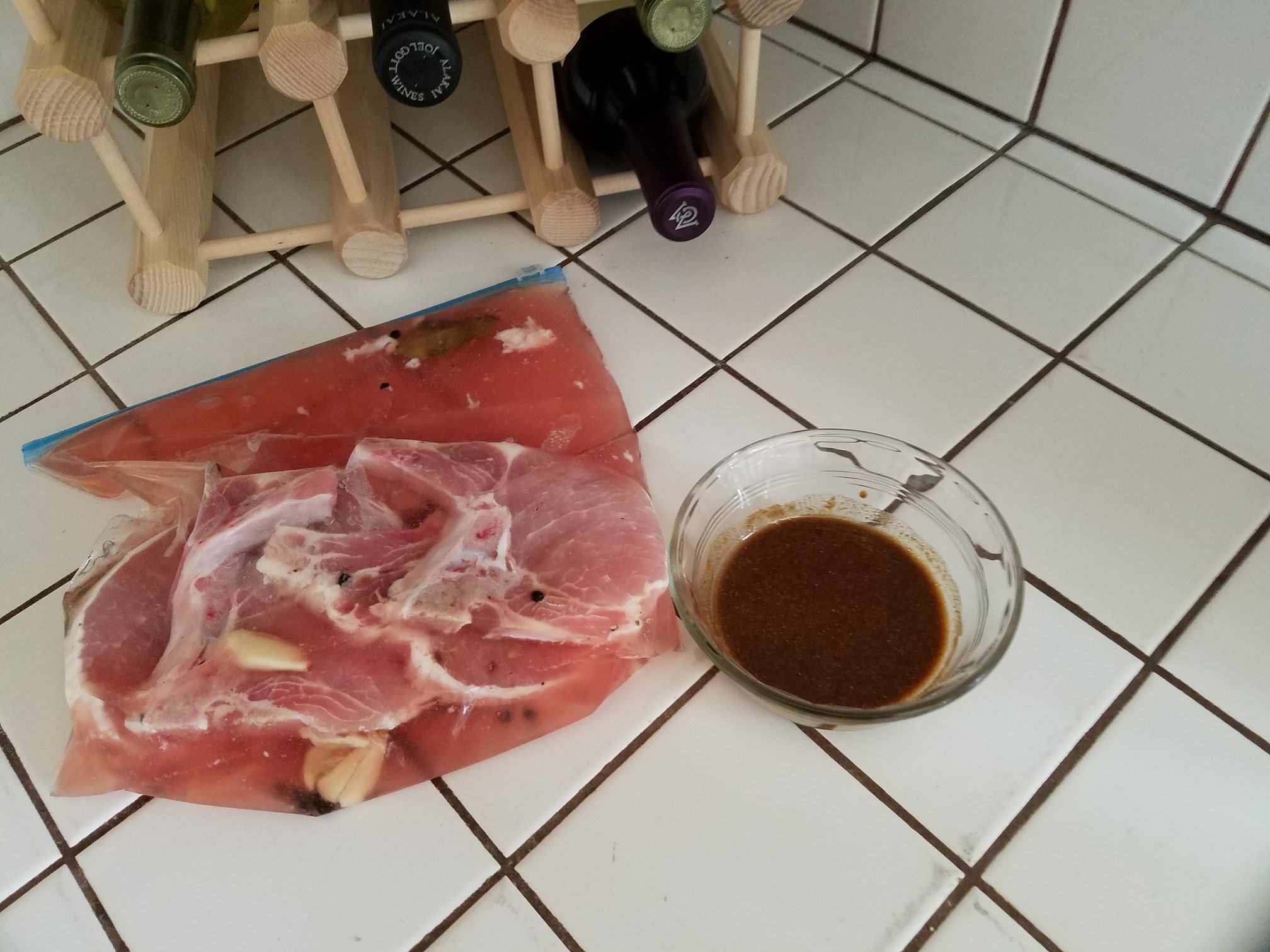In a small pot bring one cup of water to a quick boil then add in the salt. In a medium sized bowl, add in the cold water, garlic, bay leaves and pepper corns. Add the salted water to this bowl and let cool down. We are going to put the pork chops into a very familiar one gallon freezer bag along with the brine. These will be refrigerated overnight. Quick note about the brine, despite the amount of salt in the brine it will not make the meat all that salty. It’s just going to give a depth of flavor to the grilled meat. The brine will also extract some of the blood from the raw meat and will firm the flesh up a bit too. Try the brine with pork and chicken. This will make boneless skinless chicken breasts be as juicy as you always wanted but were rarely able to accomplish.
