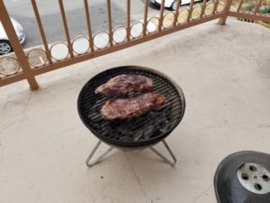 The grill is lit. Just finished the chops and the steaks are sizzlin’.