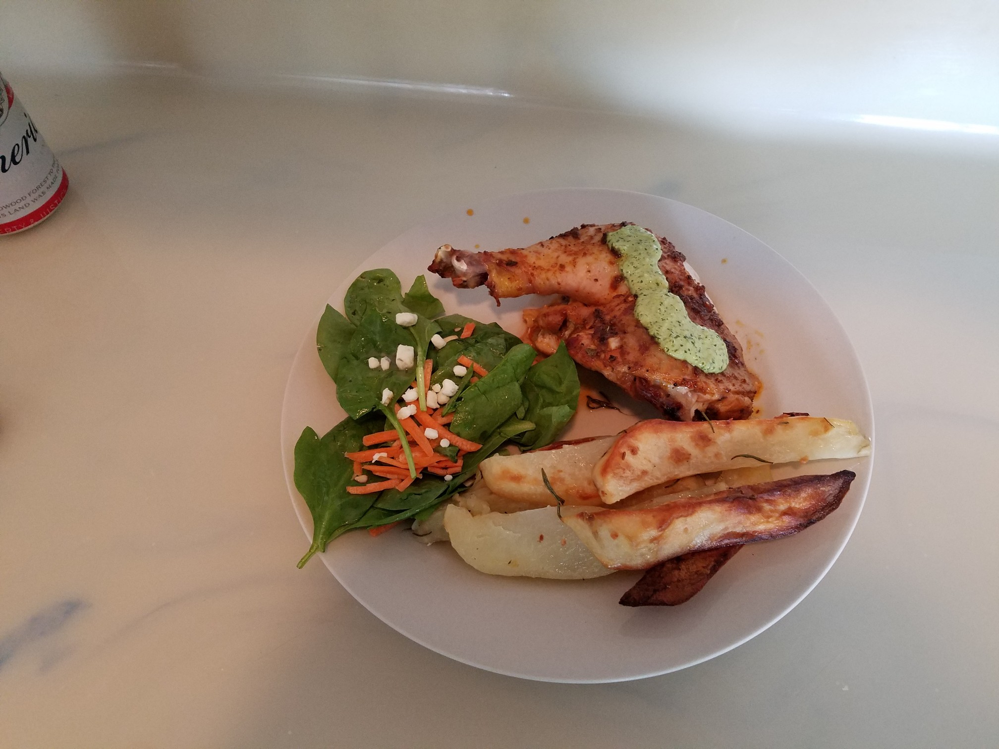 What I did for this meal was cut myself a quarter of the chicken, leg, thigh and a wing please. Get some of the potatoes on the plate and I had a little spinach salad on the side. Put some of the green sauce over the chicken and keep a little around to dip your potatoes in to. I also grabbed some garlic naan from the store and warmed up to use as a delivery vessel to your awaiting pie hole.