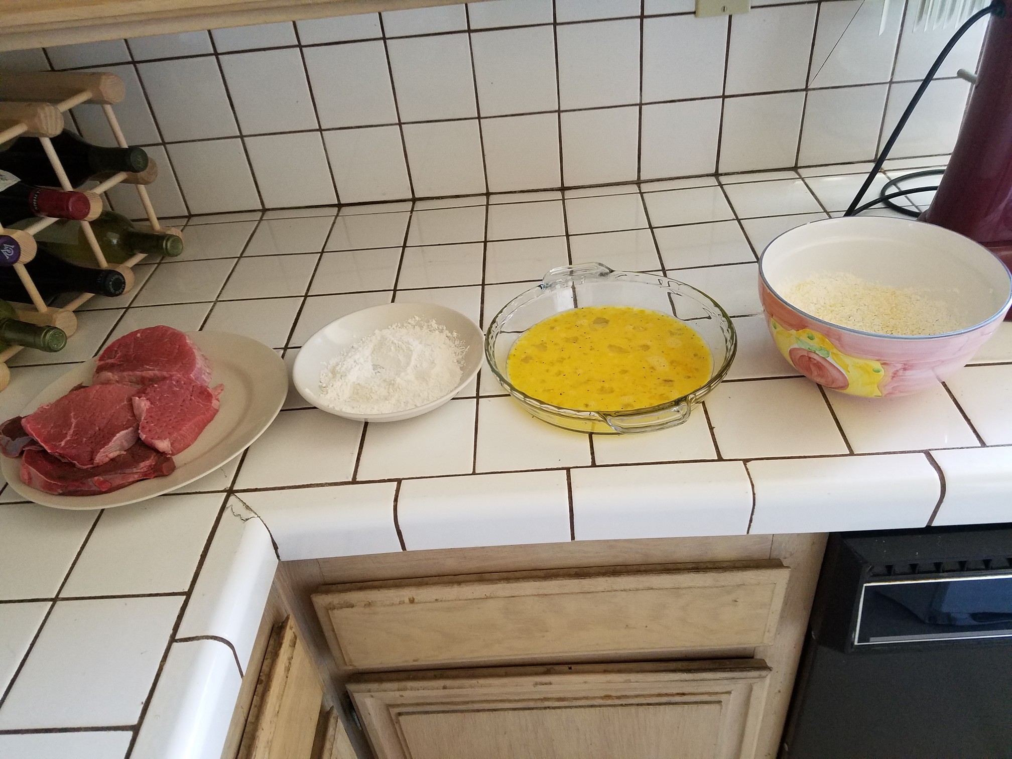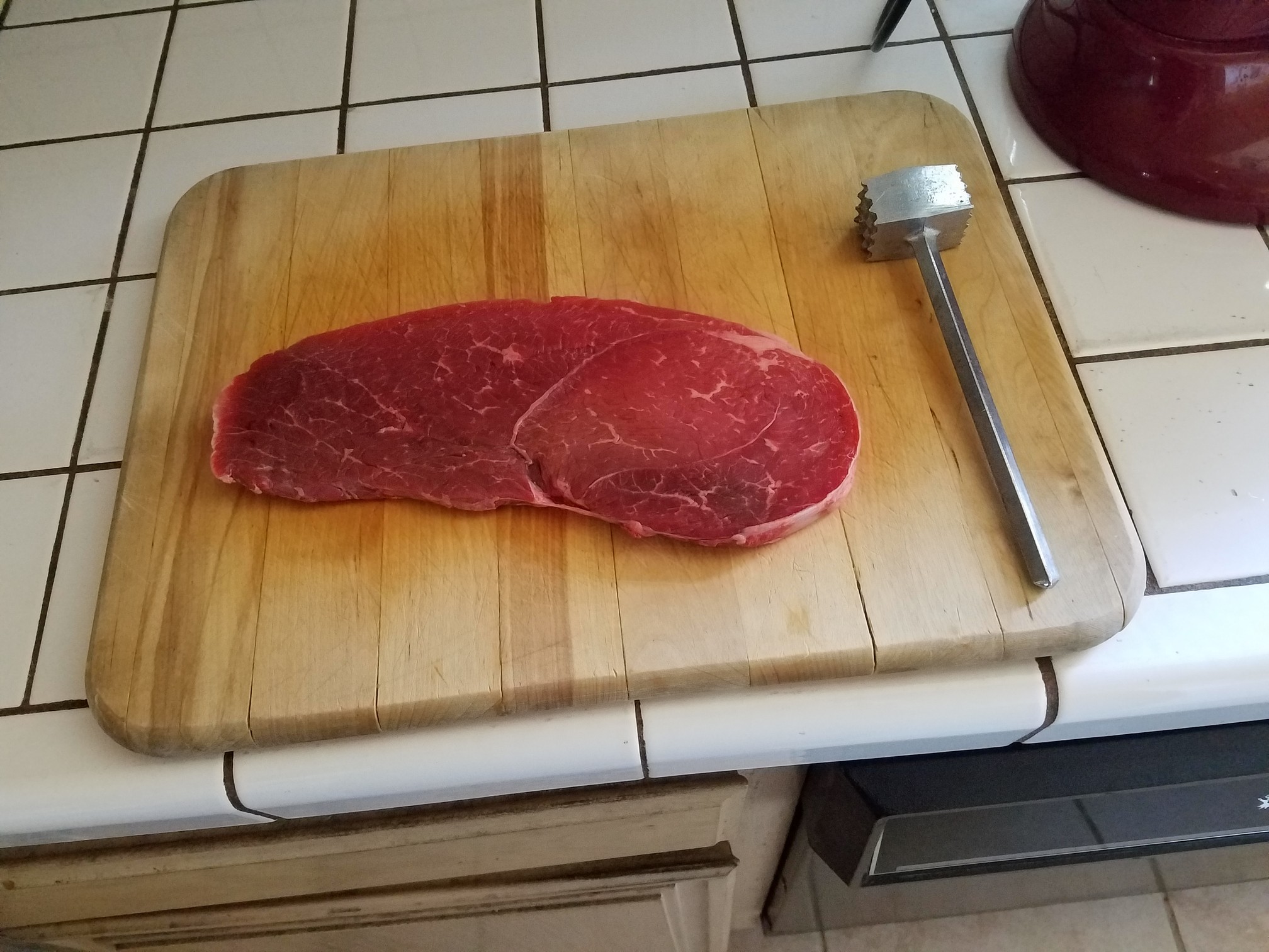 Now rinse off the blood and hair from the dead hooker that’s buried in the basement and get to pounding! Pound both sides until the meat is flattened and is ready to cooperate. It should look like this.