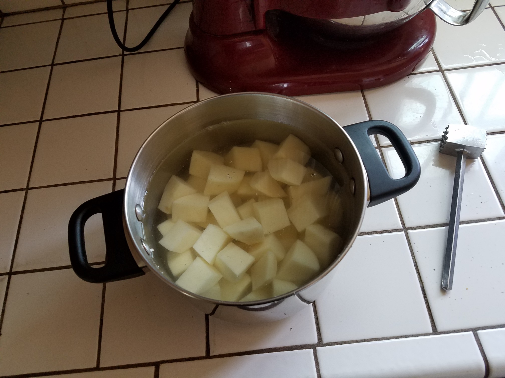 In the meantime we are going to make mashed potatoes. Alright alright. Cut a couple of pounds of peeled russet potatoes into chunks, place in a pot with enough water to cover by about 2″. Add a teaspoon of salt to the water.