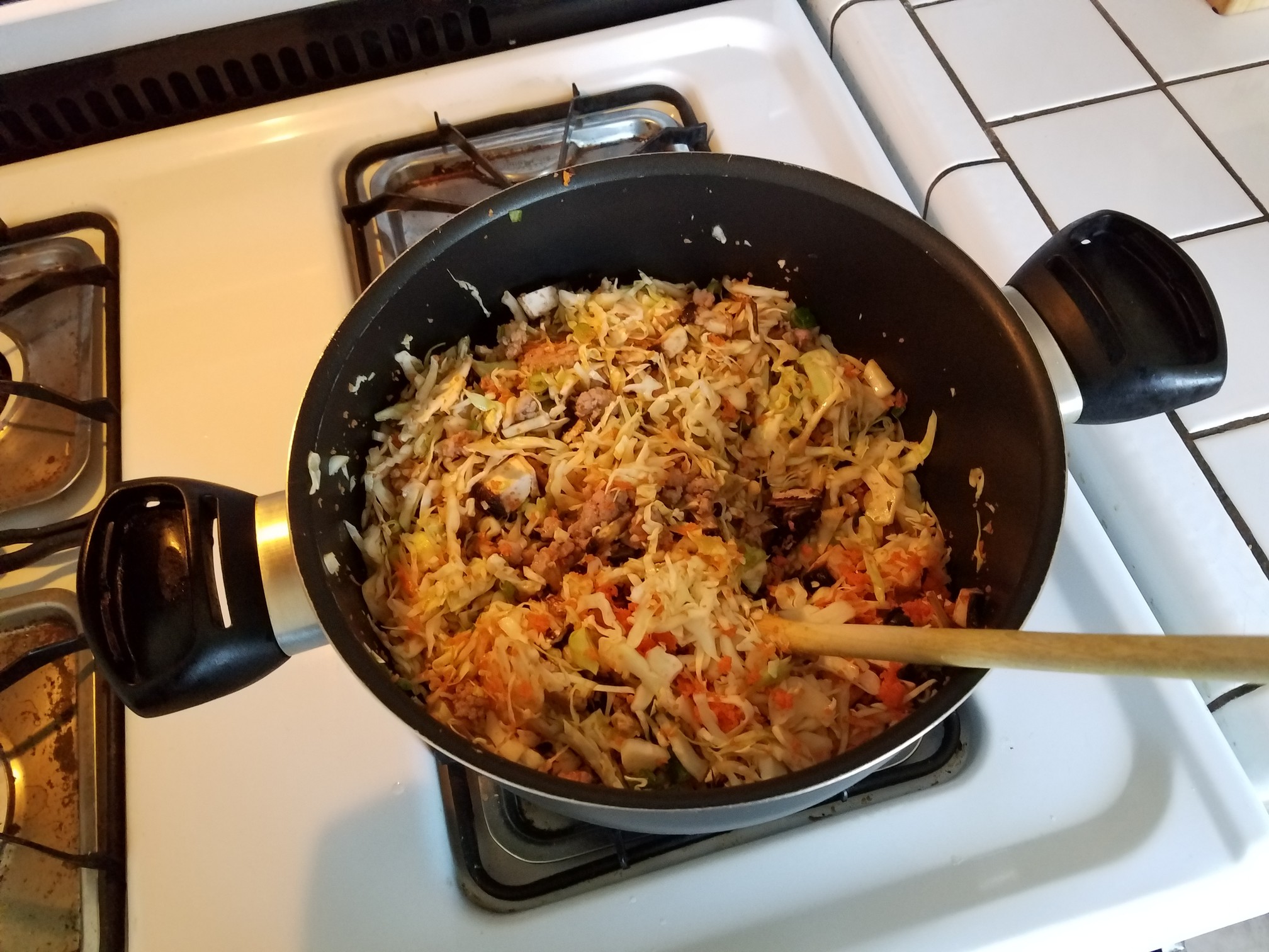 Get another pan and saute the carrot, cabbage, ginger, garlic, mushroom, sesame oil, oyster sauce, and salt and pepper. Saute for a minute or two but too much longer and the veggies will disappear from the finished egg roll.