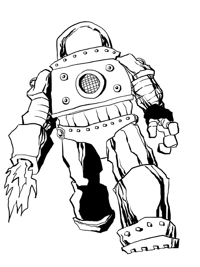 Suddenly the bay doors open. A yuuge shadow falls over the DFOers as a sixty-foot tall robot lumbers into the bay. There is a huge flamethrower instead of a right hand. The robot’s head is a plexiglass dome, where Professor Po himself sits, controlling the massive automaton.