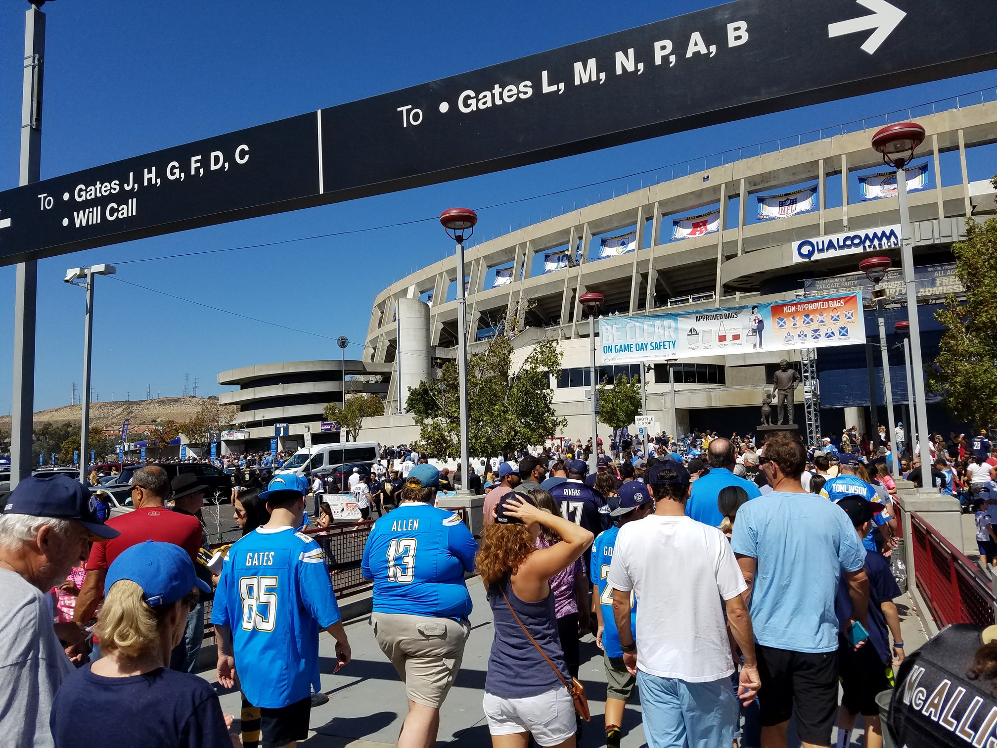 The Saints fans represented really well for this game. The Chargers fans seem to really love the powder blue unis and the most popular jerseys were Rivers, Gates, Allen, Tomlinson and Fouts. I shit you not there was someone with a Joey Bosa jersey. Dude! What the fuck! Here’s the security checkpoint again.