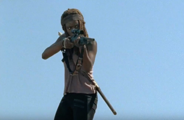 Then we cut back to Michonne sitting on her SUV. She spots a walker which is when we learn that she’s there to practice her shooting.