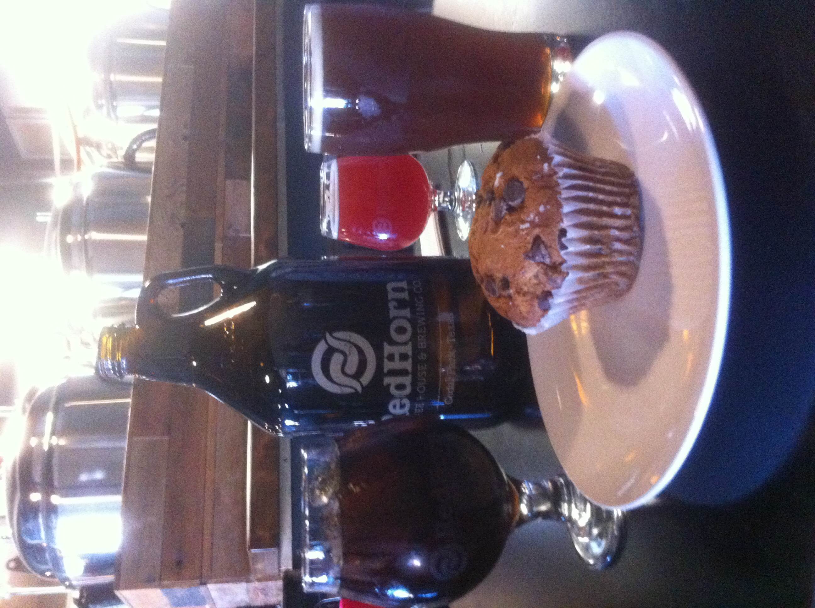 I wanted to review Red Horn as a whole experience, not just as a collection of beers. This meant, in addition to the libations, a chocolate chip banana muffin (scratch-made by the nearby Russell’s Bakery, and one damn delicious sponge for all that beer), a meat plate (courtesy of Antonelli’s Cheese Shop, with few different of meats that complemented the house brews nicely), and an iced cold-brew coffee.