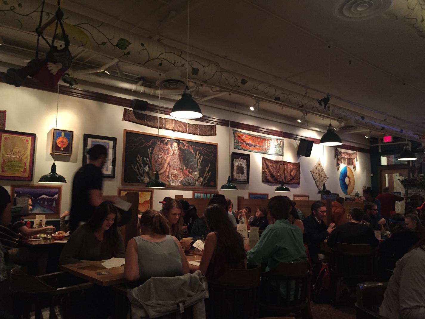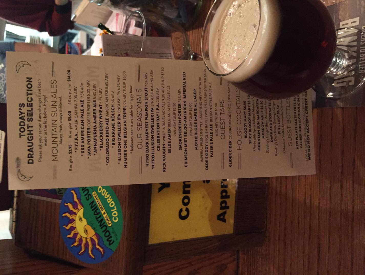 Well, hello fellow beer drinkers. This is your intrepid itinerant imbiber, BrettFavresColonoscopy, reporting and drinking from Boulder, Colorado’s Mountain Sun Brewery. Mountain Sun has several creatively named tasting rooms (Southern Sun, Under the Sun, House of the Rising Sun, wait that’s not right…), but this one here is the original and flag ship. I started off my evening with this Crimson Mist Belgo-American Imperial Red pictured right here alongside the oft-changing beer menu: