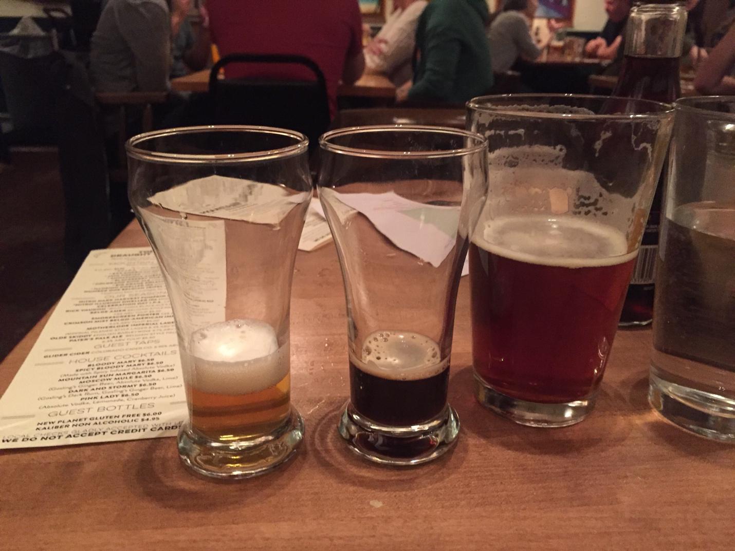 Revolution: Dry-hopped pale ale – This one is not extremely hoppy but you can still taste the hops. They do not overwhelm the beer, which I think is a good thing. I am not a fan of pale ales or IPAs, but I could easily see myself ordering this. It has good balance with lots of flavors coming through. I could see it as the pale ale version of a session beer as it’s easy drinking.