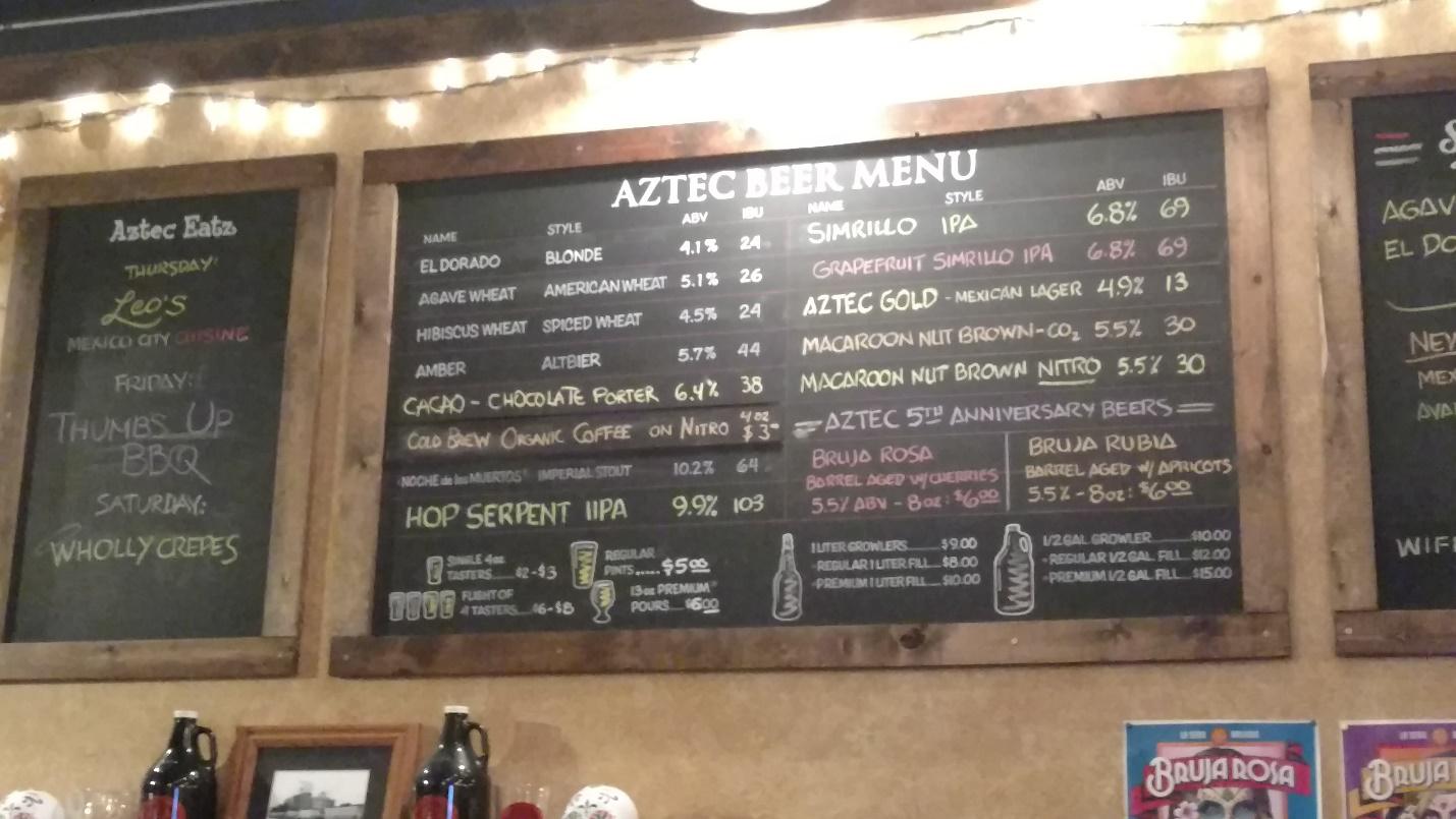Aztec Brewery is located in Vista, CA, in the heart of the North County San Diego Craft Beer scene, just off of the 78, somewhat obnoxiously referred to as “The Hop Highway” since you will find so many breweries nearby. In fact, there are at least 10 other breweries within 10 minutes of Aztec, and it can lead to some difficult (which ones do I go to?) or potentially problematic (which one do I go to first?!?) choices. Aztec opened its doors in 2011, shortly before I moved back to San Diego from Northern California, and like many of the breweries in the area, you’ll find Aztec hidden away in an industrial park, with not much else around it. It’s one of the original smaller sized breweries in the area that really pushed my love of quality beer through experimentation, and I have recently been somewhat neglectful to their wares. This is largely due to the fact that they often have live music and open mic nights later in the week, and it makes it nearly impossible to talk to your god damn friends directly across a barrel from you. We decided to go on Tuesday to avoid that issue.