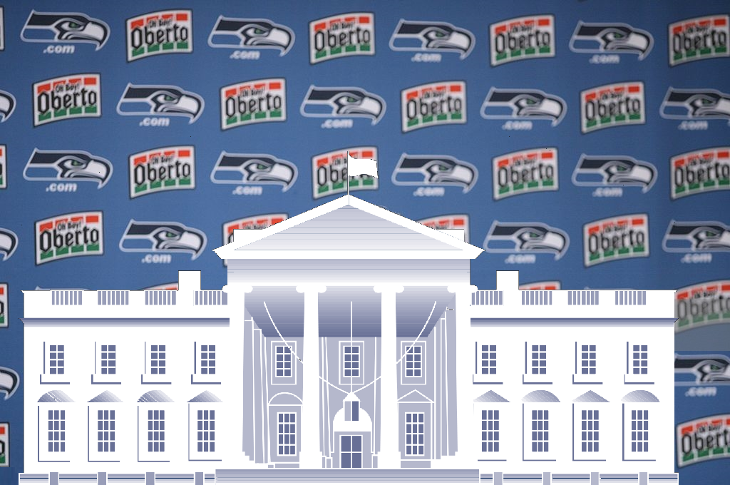 A suited individual stands before a mirror, nimbly flipping a tie between his fingers as he thoughtlessly executes a half-windsor. He is peering over his reflection to see the television broadcasting a video of Seahawks coach Pete Carroll after the tagline, “Do you agree with manner in which Richard behaves?”