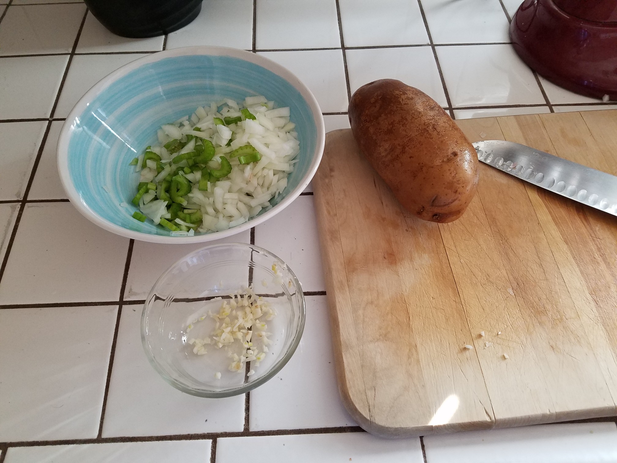 2 stalks of celery washed and chopped pretty fine. (No shit, celery is one of the dirtiest damn veggies ever when you bring it home from the store. Wash it’s nasty ass down well before starting.)