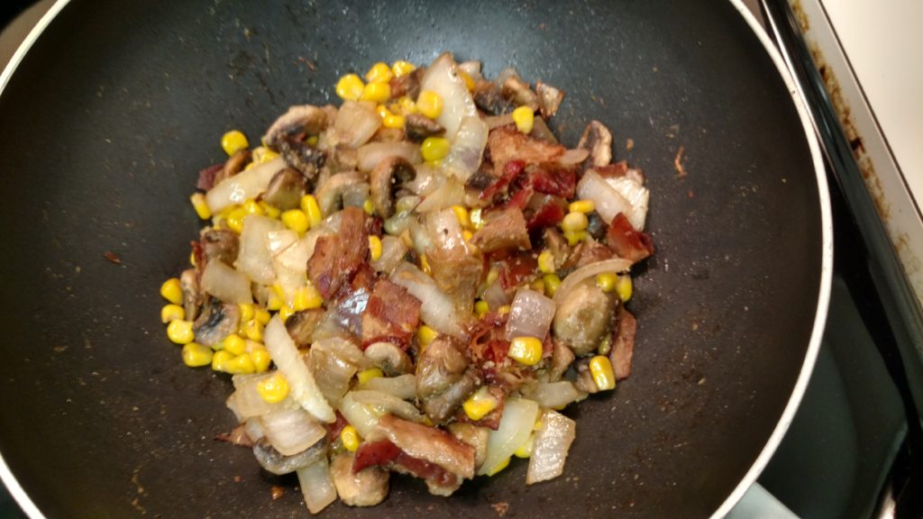 Anyway, get out a decent sided wok or large pan and get it warmed up on the stove at medium heat. Start cutting up your bacon into about inch wide pieces. In this case, I used already cooked bacon to save a little time, but cooking up the good stuff is certainly recommended. As soon as that pan is hot, fry up that wonderful, magical animal, and then get to work chopping up that onion and those mushrooms. Make sure you rinse the mushrooms off, after you’ve pulled the stems out. Once the bacon has cooked a bit (you don’t want this fully crispy yet, there is a ways to go,) you should have a nice layer of grease down ready to cook up what you just diced up. Toss them in and watch them sizzle! If you used the precooked stuff like me, or think you need a little more grease, add a dash of the olive oil and stir it up nicely.