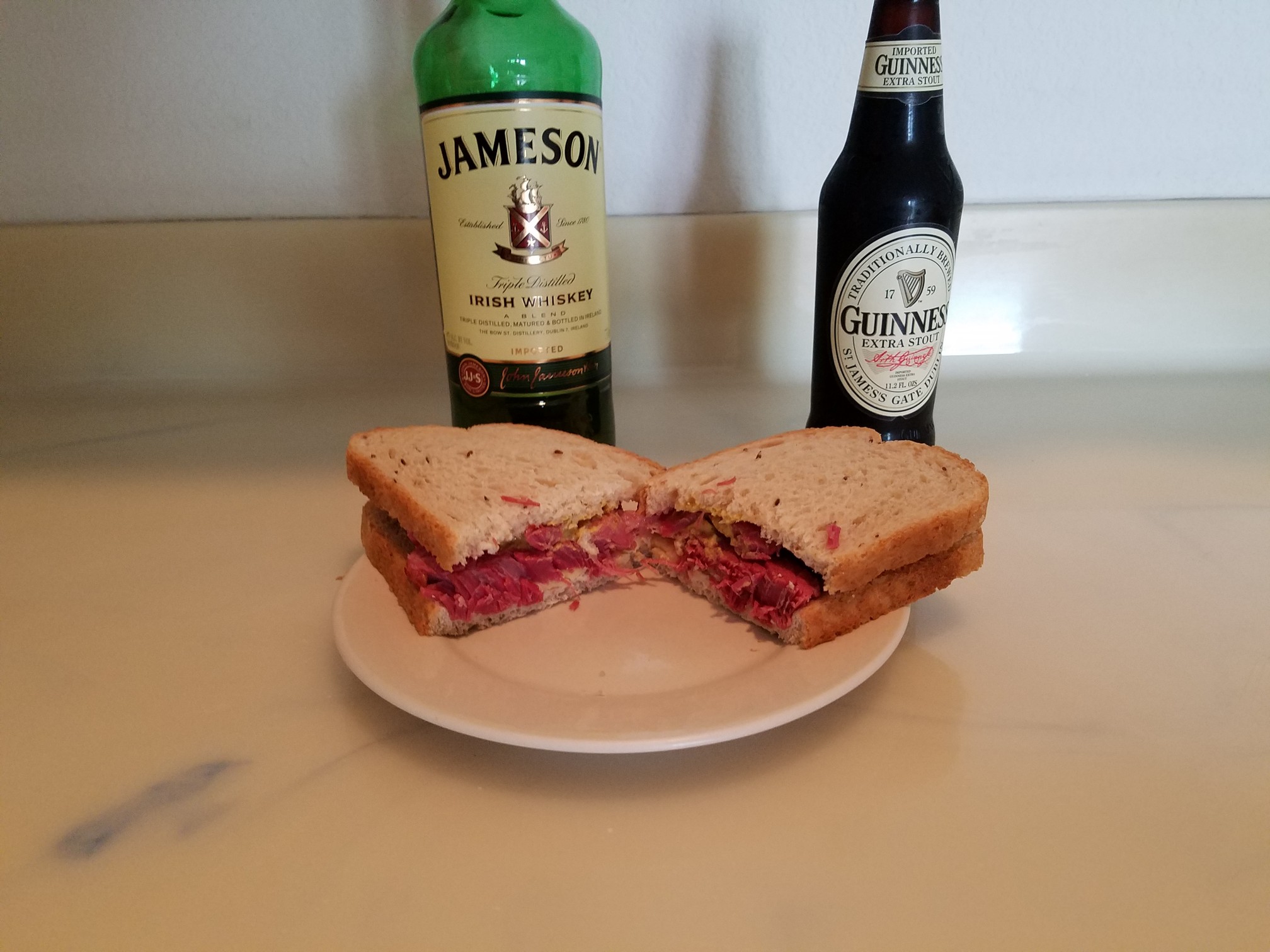 The corned beef in the photo was cooked using the rinse, cover in mustard, wrap in foil and bake for 3 1/2 hour technique that is mentioned in the link above. I sliced it thick when done and used a layer of thin sliced aged Irish cheddar on the bottom slice of the sandwich and used more mustard on the top slice.
