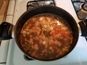 Add in the cubed potatoes for the last half hour of cooking. About 5 minutes before serving stir in the roux to thicken and you are ready to party.