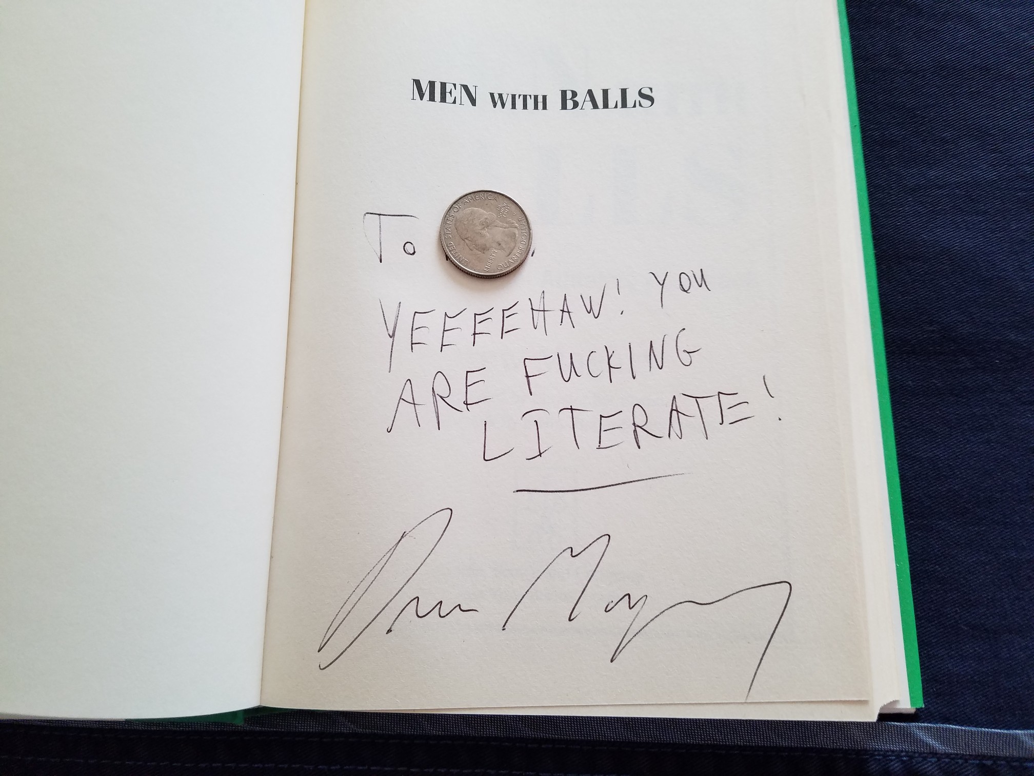 I covered up my name with the quarter so nobody would find out that my real first name is “Trudy.” Drew was really fucking cool to do this for me. I mailed him the book. My book. That I purchased myself. Sent it to Drew with a stamped addressed return box and presto! You’re my boy, Drew!