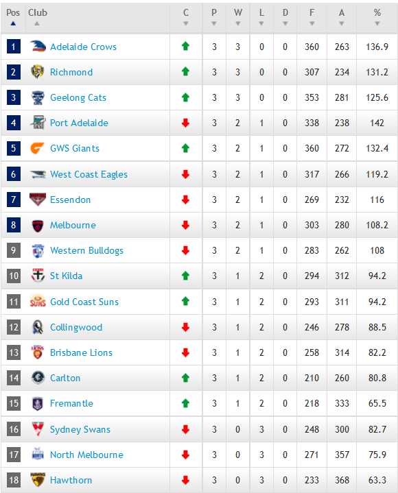 I’ve opted to insert this image of this week’s ladder rather than use balls’ normal chart.  Why?  Look at the bottom and you’ll see.  Sydney and Hawthorn both winless and sitting in the cellar WITH BIG RED DOWN ARROWS!!!!!  Sadly, they can’t go much lower.  *sigh*