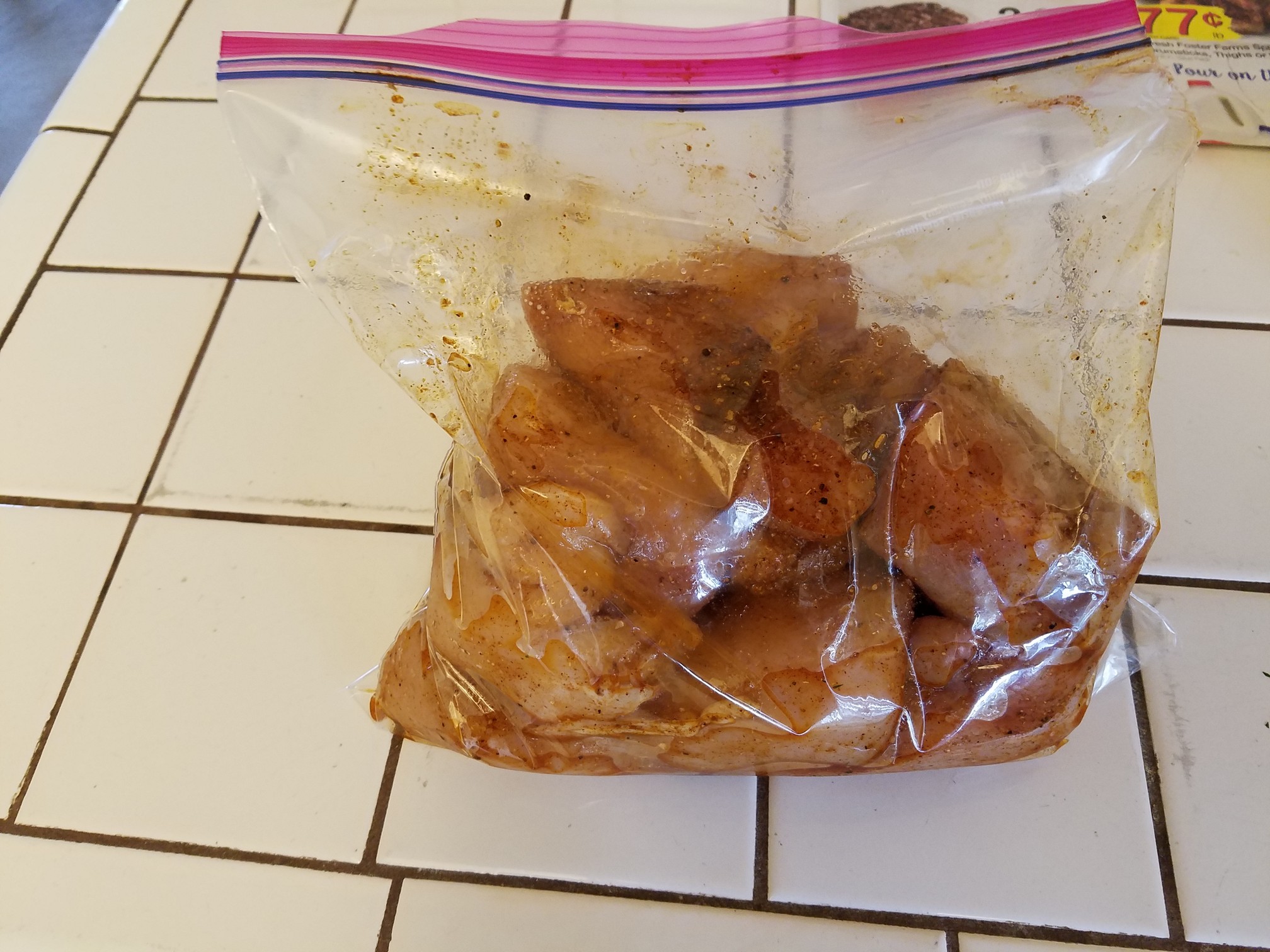 Now get that chicken into the fridge and let marinate for at least 4 hours or all the way up to overnight. I place the bag of chicken into a large bowl before refrigerating to mitigate potential spillage issues.