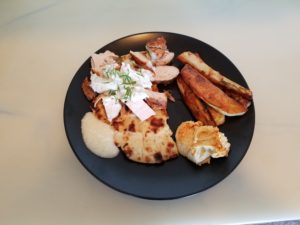 That’s the sliced chicken, covered with some of the yogurt tahini sauce sitting on the naan on the top of the plate, potatoes next to it, clockwise heading down is the fresh hummus followed by the TOUM!