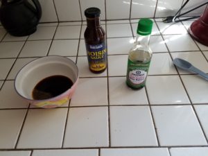 Next combine the soy, sesame oil, hoisin, brown sugar, water, Szechuan pepper and red pepper flake to another bowl and mix well.