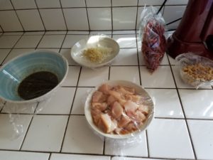 Combine the sake and first batch of corn starch with the chicken and get a quick marinade going, maybe 10 minutes or so.
