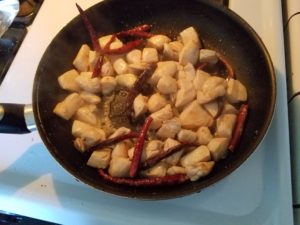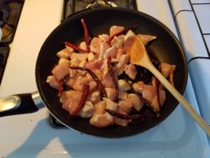 Heat up the skillet on high, add the peanut oil and then the chilies. Cook the chilies until browned slightly and very fragrant. Next get a sear going on the chicken, we will saute them with the chilies like a bad motherfucker.