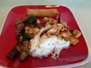 Get the rice on the plate, add a scoop of Mongolian beef then add another scoop of the chicken dish. If you want an egg roll feel free to make them from the linked recipe if you choose. I didn’t feel like using the time to make homemade egg rolls since this was a first attempt at some new recipes. The egg roll in the photos was store bought. I regret nothing!