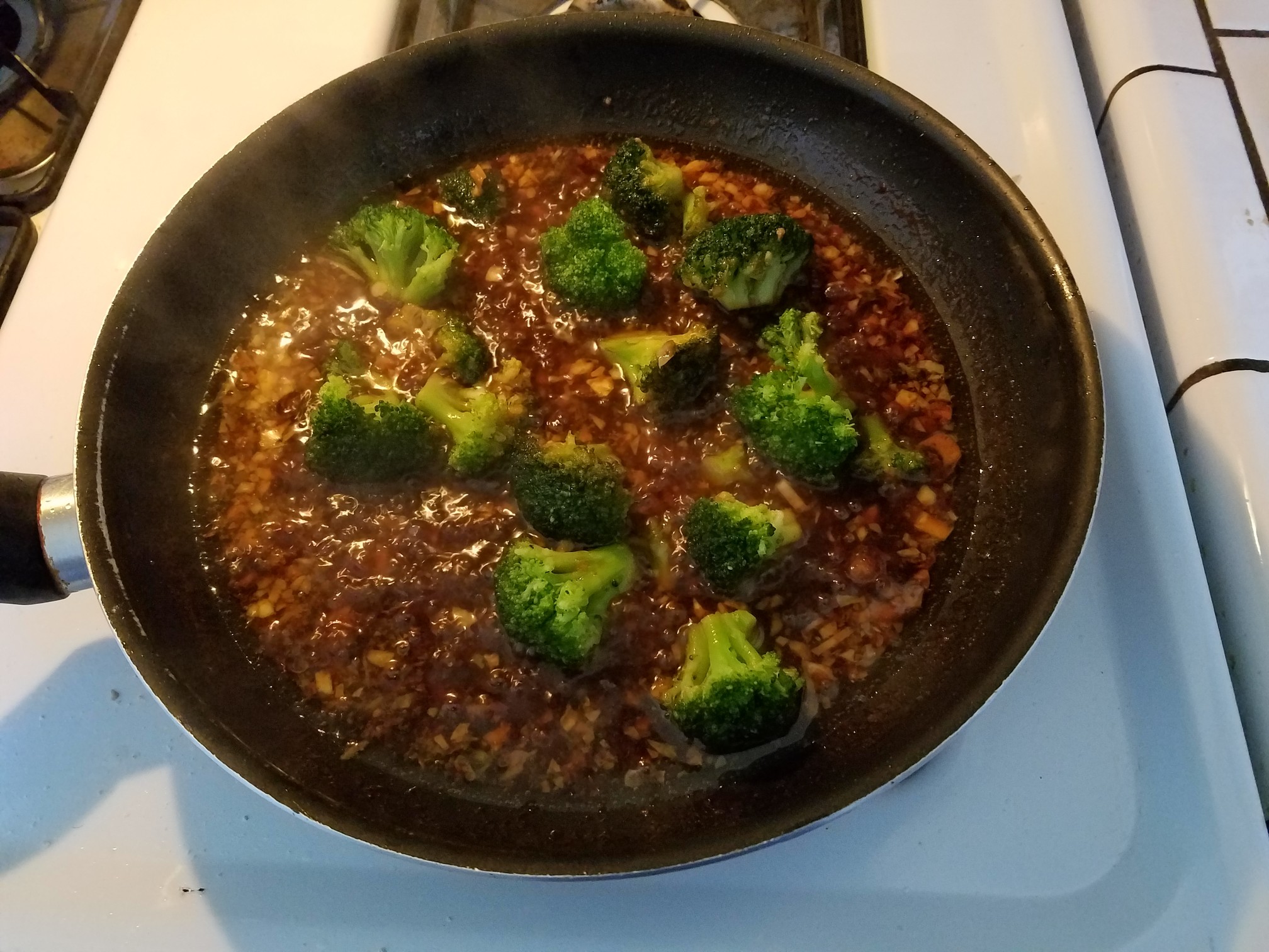 This is going to simmer, well actually it’s a fuck ton hotter than just a simmer but you know what I mean. This will cook and thicken for about 4-5 minutes. And this fucker smells incredible. Now we’re going to add the broccoli and cook for about 3 additional minutes.