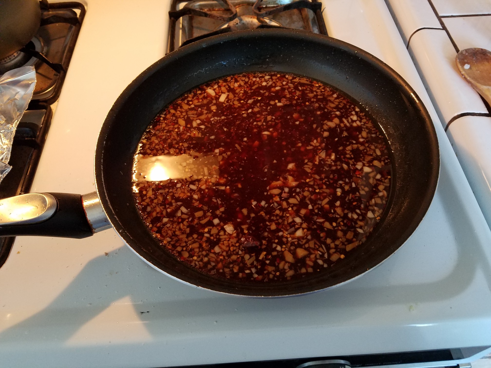 Next we are going to toss the garlic, ginger and scallions into the pan and saute for just a few seconds until fragrant. Now let’s add in the prepared sauce and get that shit cooking.