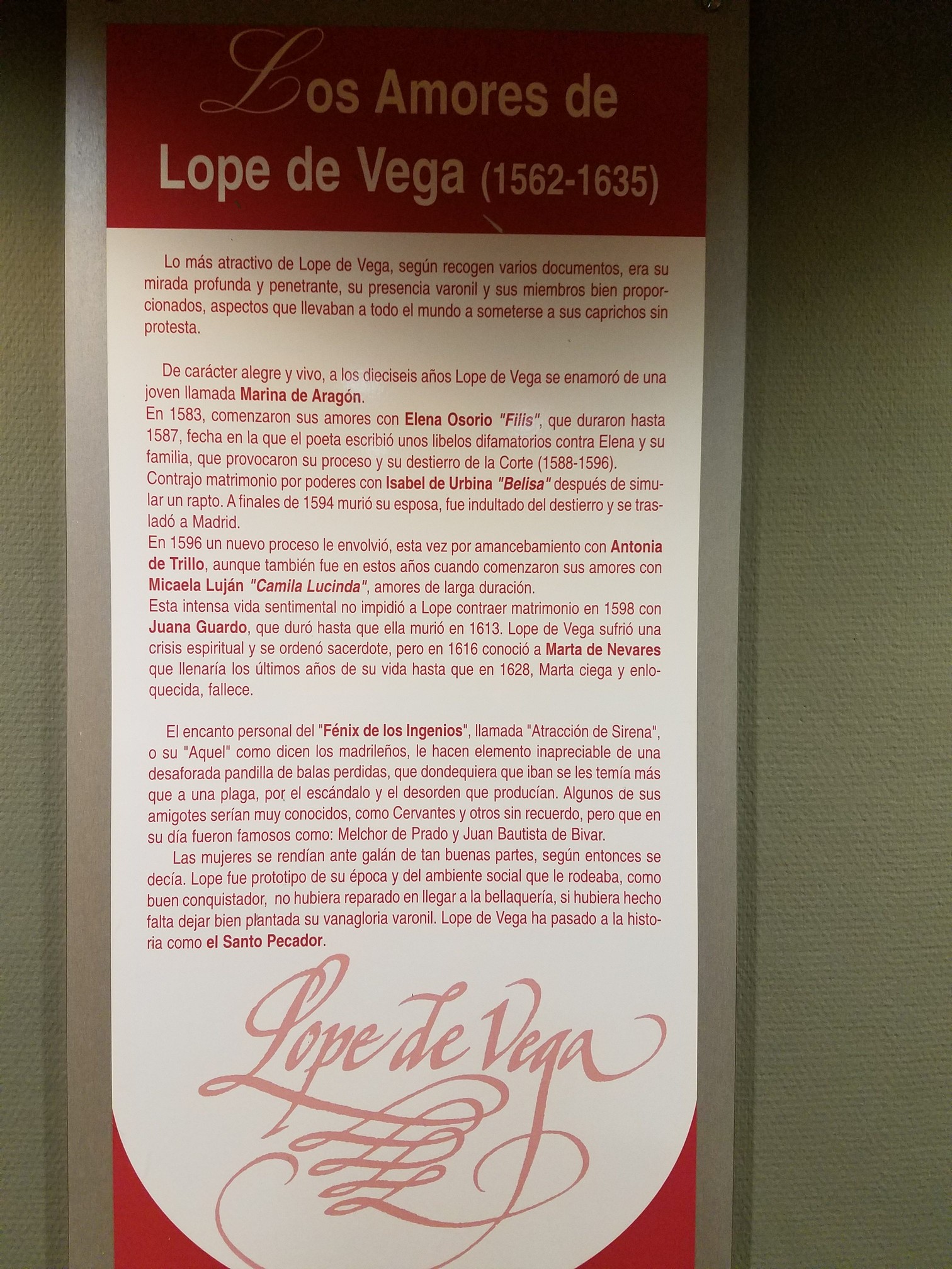 #6- The hotel we stayed at in Madrid was on Calle Lope de Vega and it, in fact, used to be called Hotel Lope de Vega. On the walls, they interesting stuff from him and about him. I took a picture. I’m going to try to upload it to share.