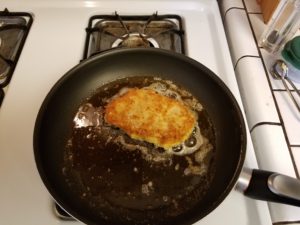 We’re going to cook one schnitzel at a time in the hot skillet. Get that coated meat into the skillet.