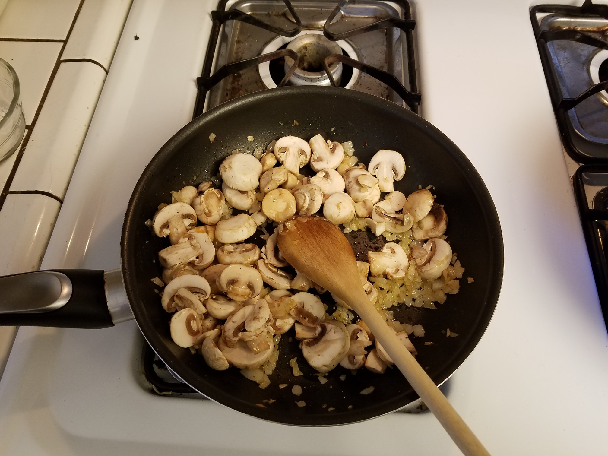 After about 5 minutes the onion should be translucent and cooked a bit. Now we add in the mushrooms and let them cook with the onion for about 5 minutes.