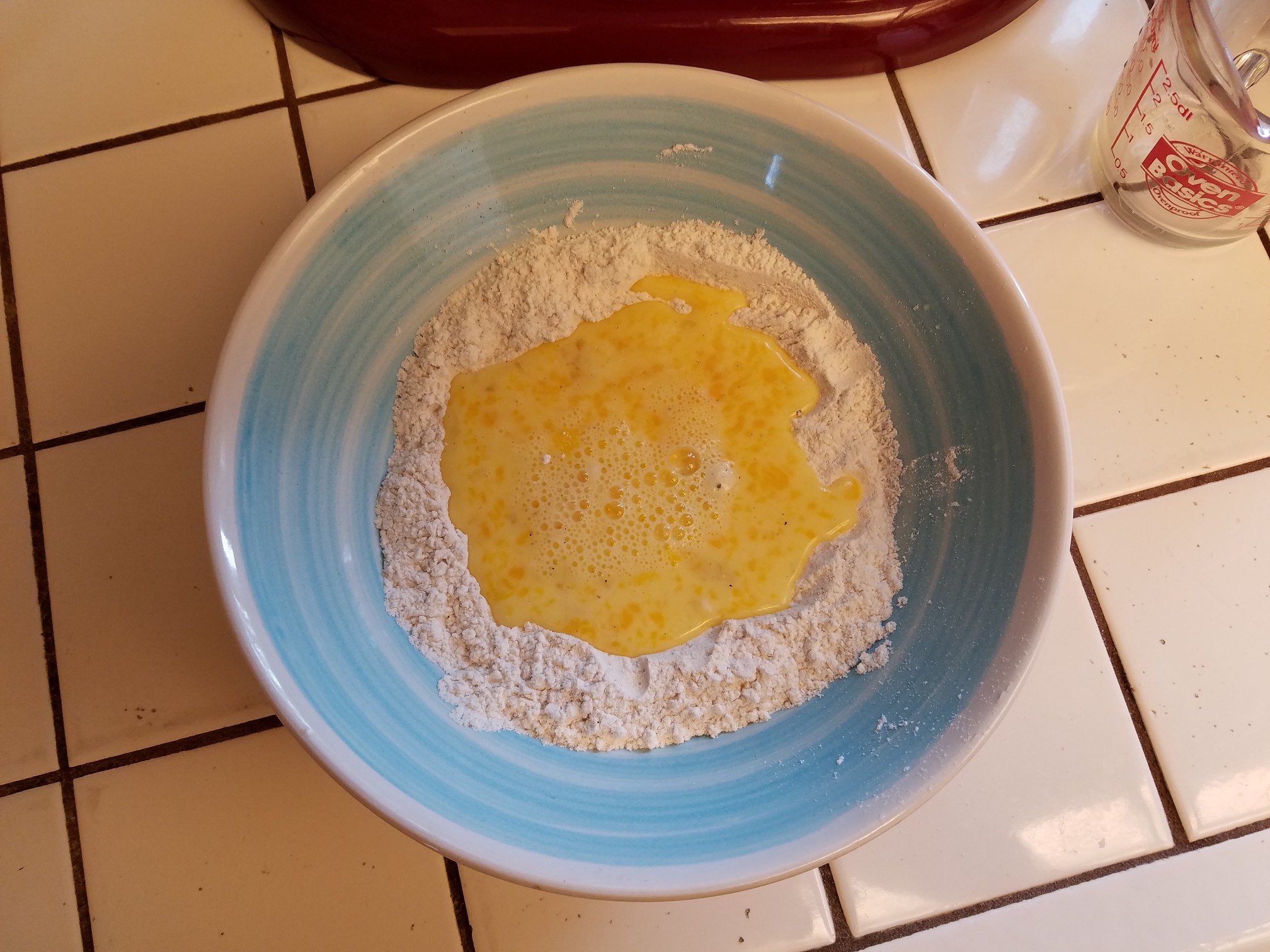 In another small bowl, mix together the beaten eggs and milk and add them into the well of the dry ingredients thusly.
