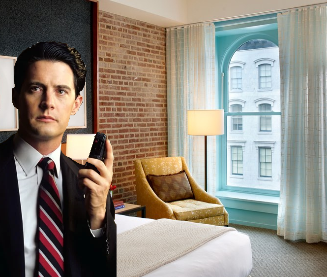 Agent Dale Cooper (to handheld recorder): Diane, I have checked in to my accommodations at 21c Museum Hotel. Situated on the 18th floor, the malfunction of one elevator means either taking the stairs — at nearly 500 feet above sea level — or a lengthy wait to get to or from the lobby. Less this minor inconvenience, the room is cozy, clean, and serviced by competent hospitality industry professionals. I expect to receive both the coroner’s report regarding the death of Ben Gal’s near-rookie Lin Sue as well as a local breakfast platter that centers around a local breakfast delicacy, goetta.