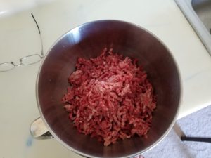 Crank the mixer speed up to about the 4th setting and let it rip. It took just a couple of minutes after I figured out the completely obvious. After grinding we had a lovely bowl of freshly ground meat.