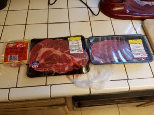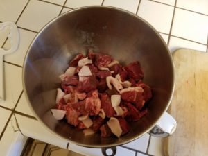 That’s a little over 2 pounds of chuck roast, about 2/3 of a pound of bottom round sirloin and a package of salt pork. I was thinking about adding in some bacon for both flavor and fat but the bacon at the store was too fucking lean!