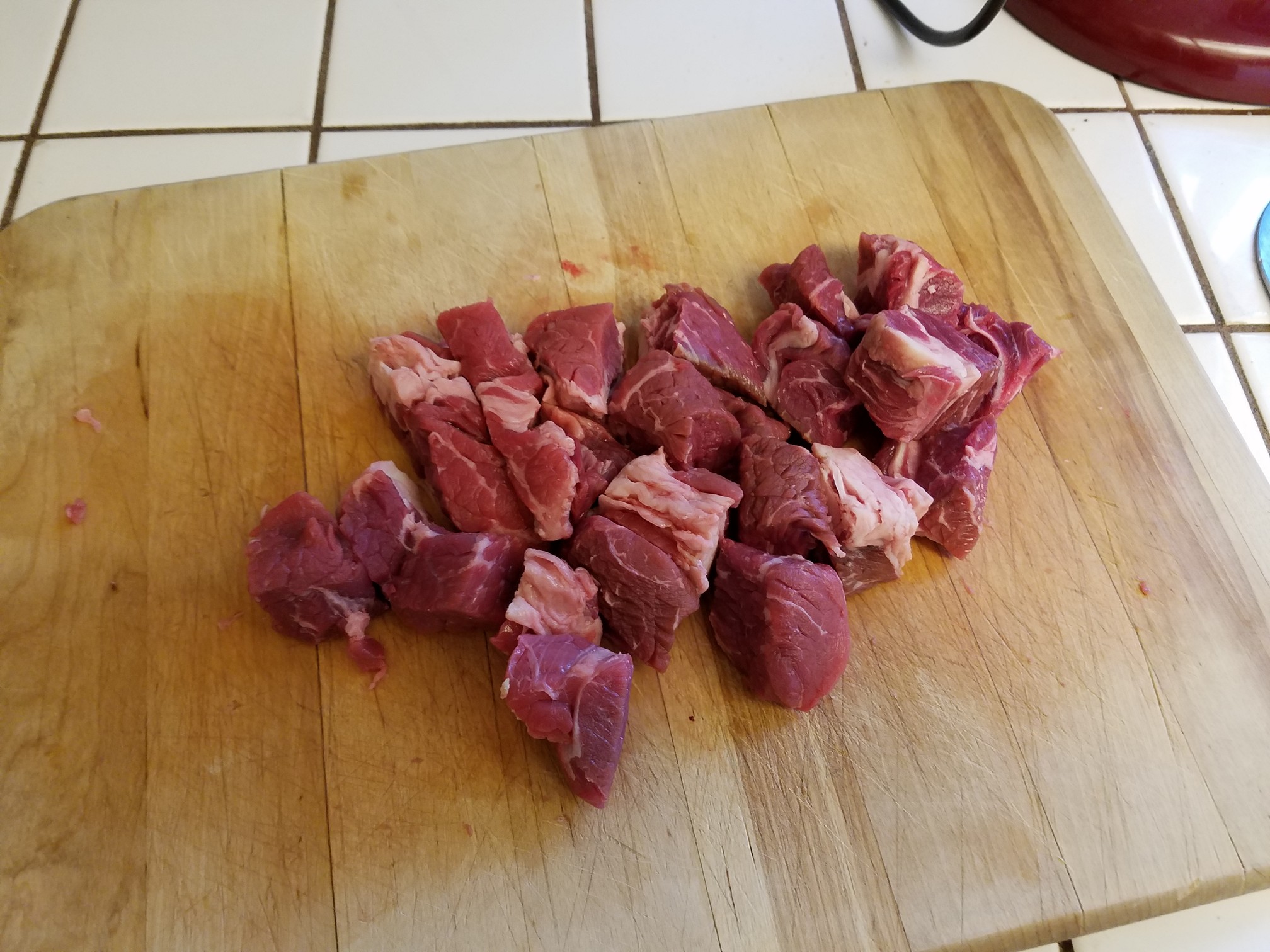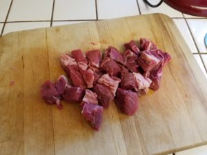 Cube up the chuck roast removing any gristle lines if you encounter them.