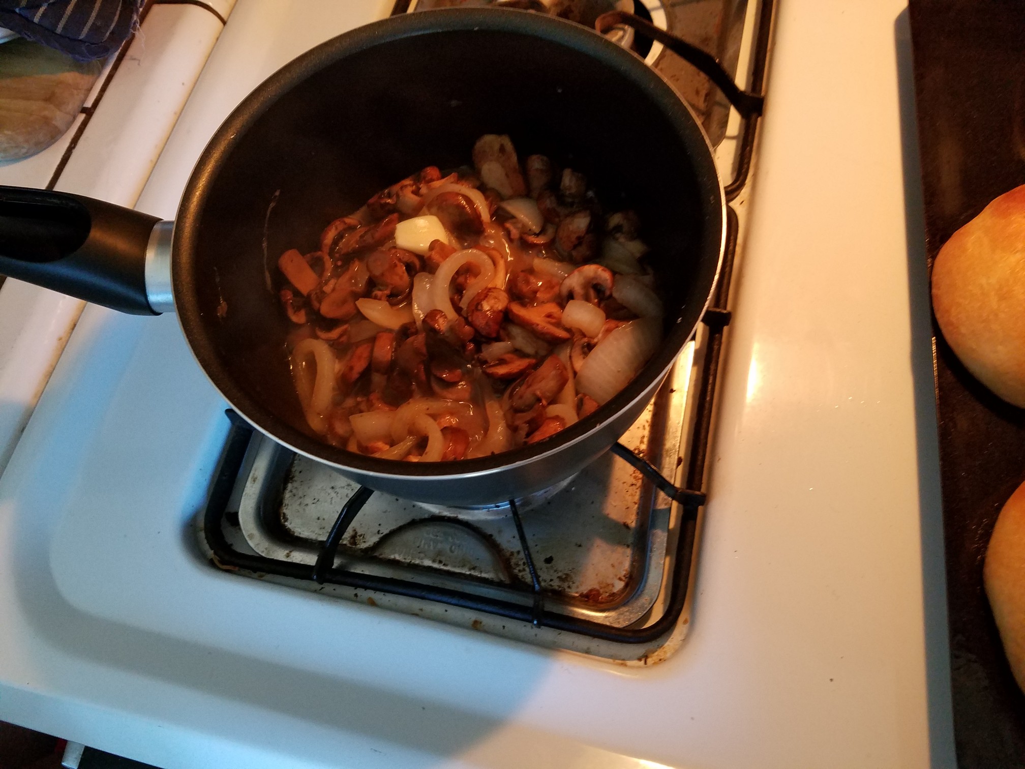For my second burger I added a little swipe of mayo on the bottom bun, put the burger on and covered with some mushrooms and onions that had been sauteed in butter and garlic.