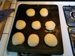 Let the dough double in size, about on hour or two then gently punch it down and divide into 8 pieces. Since this was my first go at this there was a distinct lack of uniformity related to the bun size. I don’t have a kitchen scale (yet) so I just divided the dough in half and then each half into fourths to produce 8 balls of dough. Using your hands roll the dough into a nice round shape, gently press down on the top of each ball to flatten slightly and place on a greased baking sheet to – yep – rise again until doubled in size. About another hour of rise time.