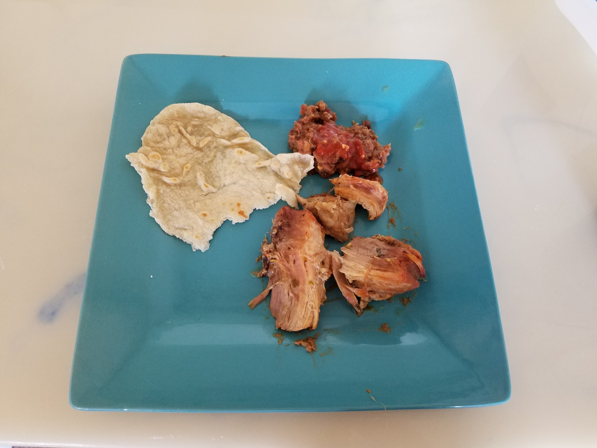I have to admit despite it’s odd look and unique shape this tortilla was goddamn tasty. It had the right thickness, the right pliability and it was really good. I used the old fashioned technique of just ripping off a piece of tortilla then grabbing some meat and beans with it and and then shoving it into my face.